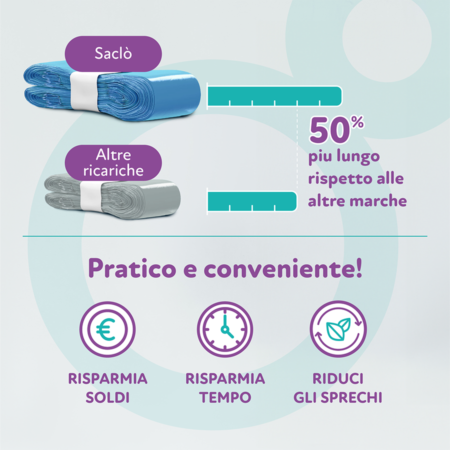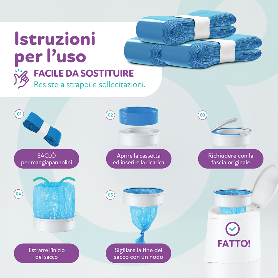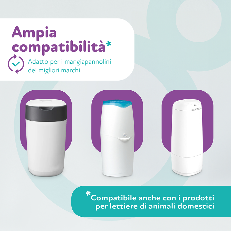 Le ricariche per mangiapannolini Saclò sono compatibili con le migliori marche di mangiapannolini come Angelcare di Foppapedretti e Tommee Tippee.