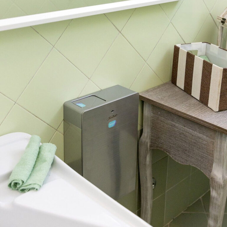 A small sensor detects the presence of a hand, automatically opening the lid to allow personal hygiene waste such as sanitary napkins, tampons or handkerchiefs to fall into the bin. The total absence of contact with the hands is very important for the hygiene and comfort of women, especially in public or company toilets where many women use the bin to throw away their used sanitary napkins.