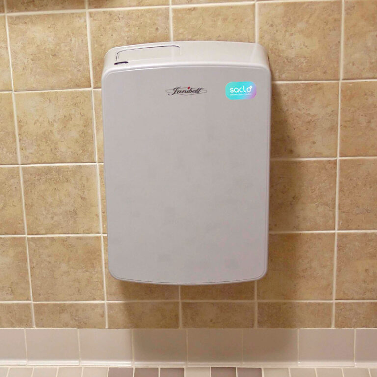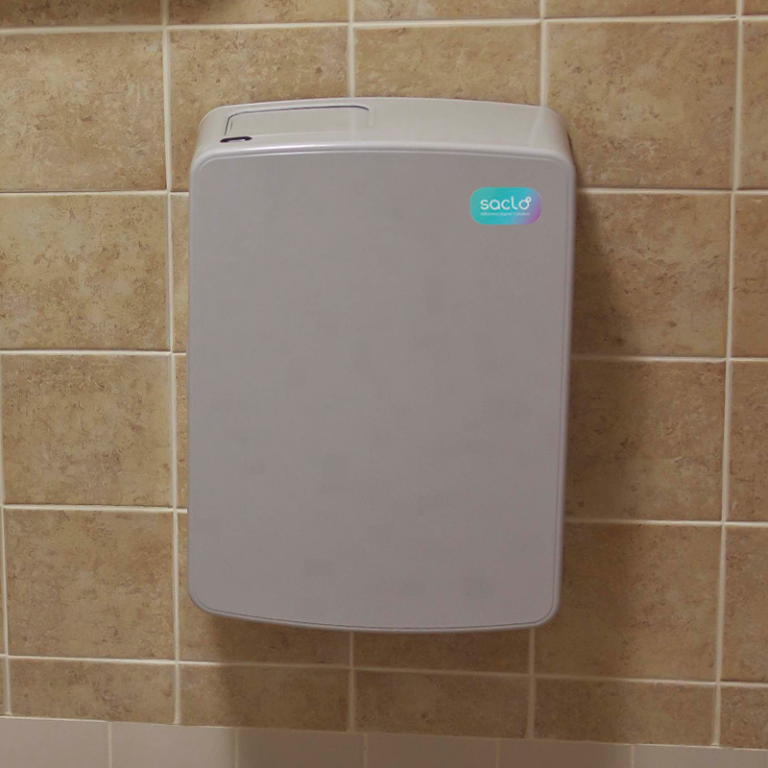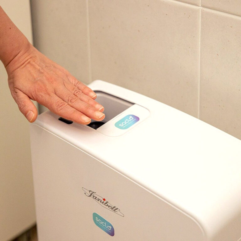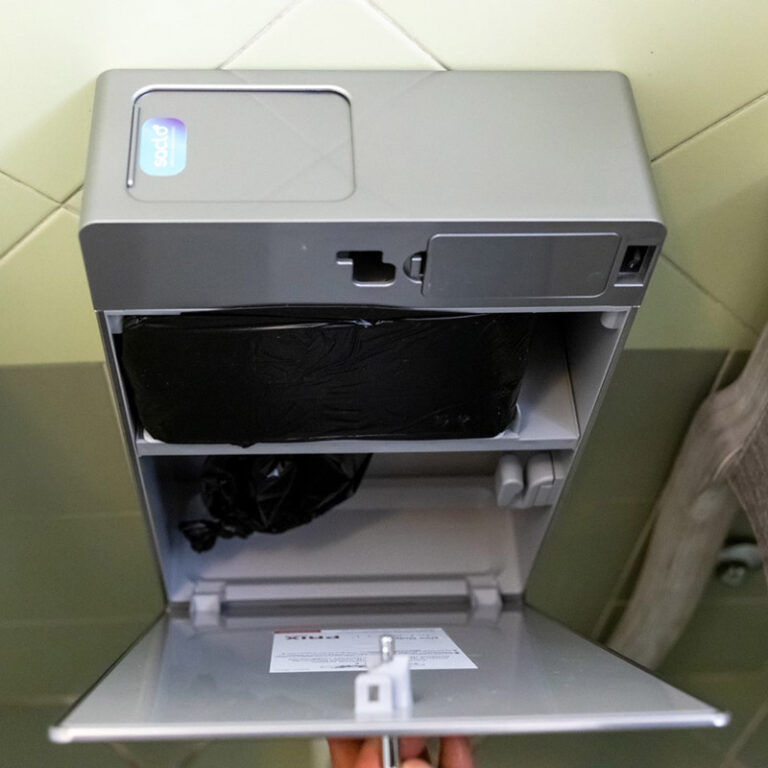 It contains a small continuous bag about 12 metres long which allows collecting the waste daily without touching the dirty area, limiting plastic waste as much as possible and optimising bag change times for cleaning staff.