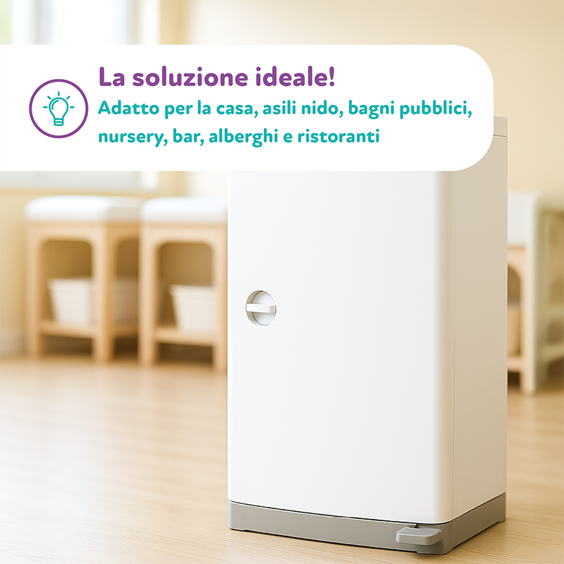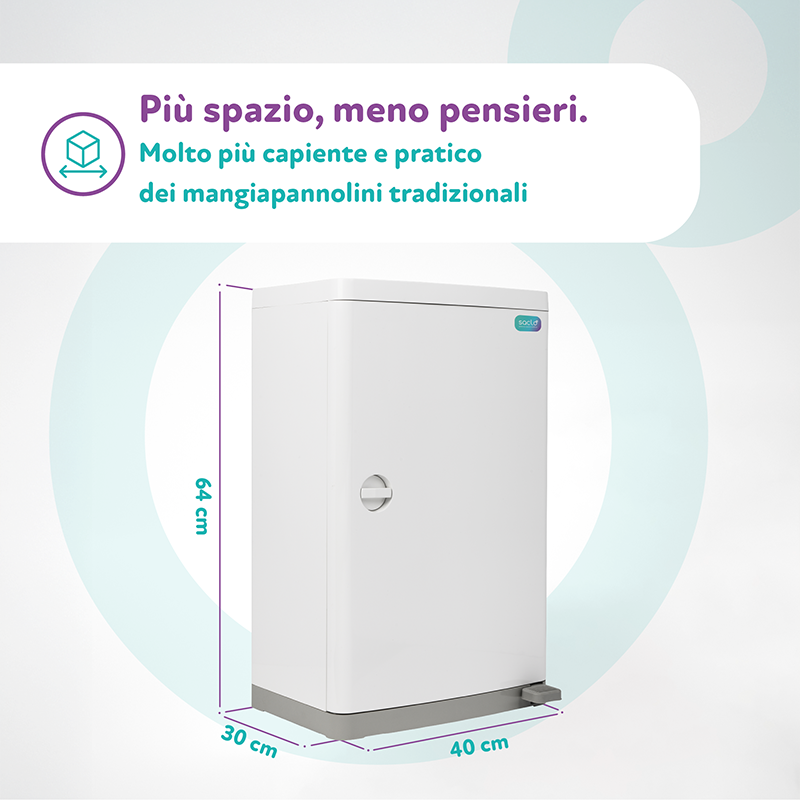 E’ ideale anche per uso domestico, quando il bisogno di praticità non accetta compromessi. La sua capienza, il comodo cambio sacco e l’efficace sistema odor-control rendono Saclò Baby l’aiutante perfetto nel bagno di casa.